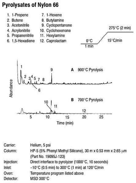 Gas chromatography with an Agilent J&W CP-Sil 5 CB column separates nine residual solvents in a sample of video tape in 70 minutes.