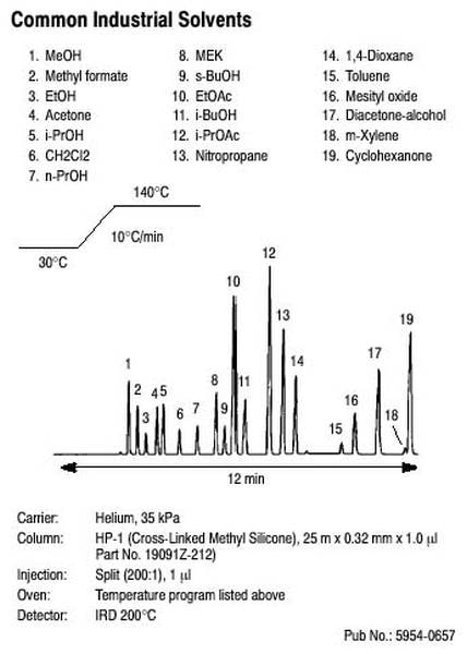 Gas chromatography with an Agilent J&W CP-Wax 52 CB column separates 35 solvents in 12 minutes.
