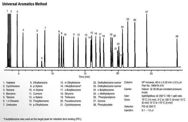 Gas chromatography with an Agilent J&W CP-Select 624 CB column separates 25 constituents in a toluene sample in 17 minutes.