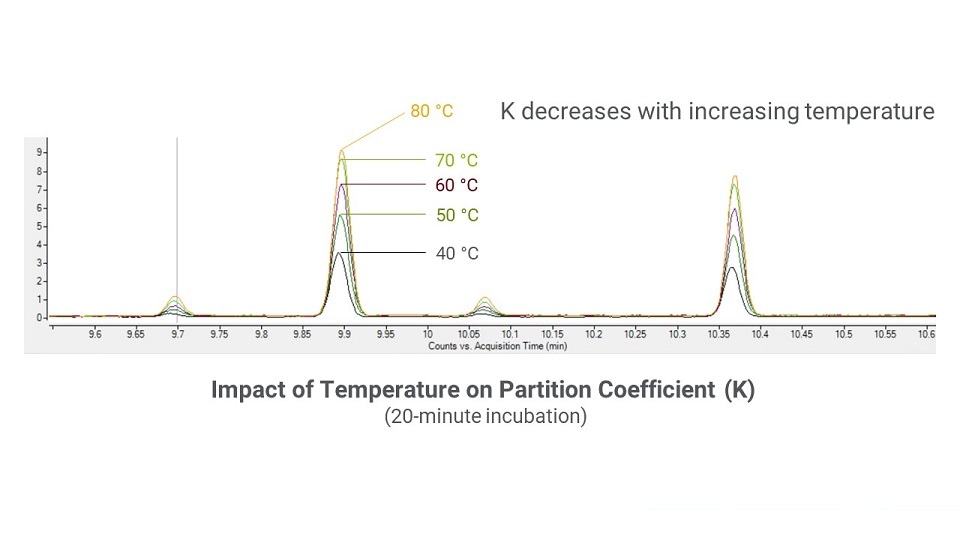 To demonstrate the temperature influence on K, Figure 8 shows chromatograms for a sample that was equilibrated for 20 minutes across a range of temperatures. The higher temperature runs resulted in a higher detector response, which corresponds to more analyte in the gas phase. As an example, the K value for ethanol in water at 40 °C is ~1350. At 80 °C, the K value decreases to ~330. At some temperature setpoint, the detector response will not increase further with increasing temperature, which indicates that K has been minimized. Note that the maximum oven temperature should be kept around 20 °C below the solvent boiling point.